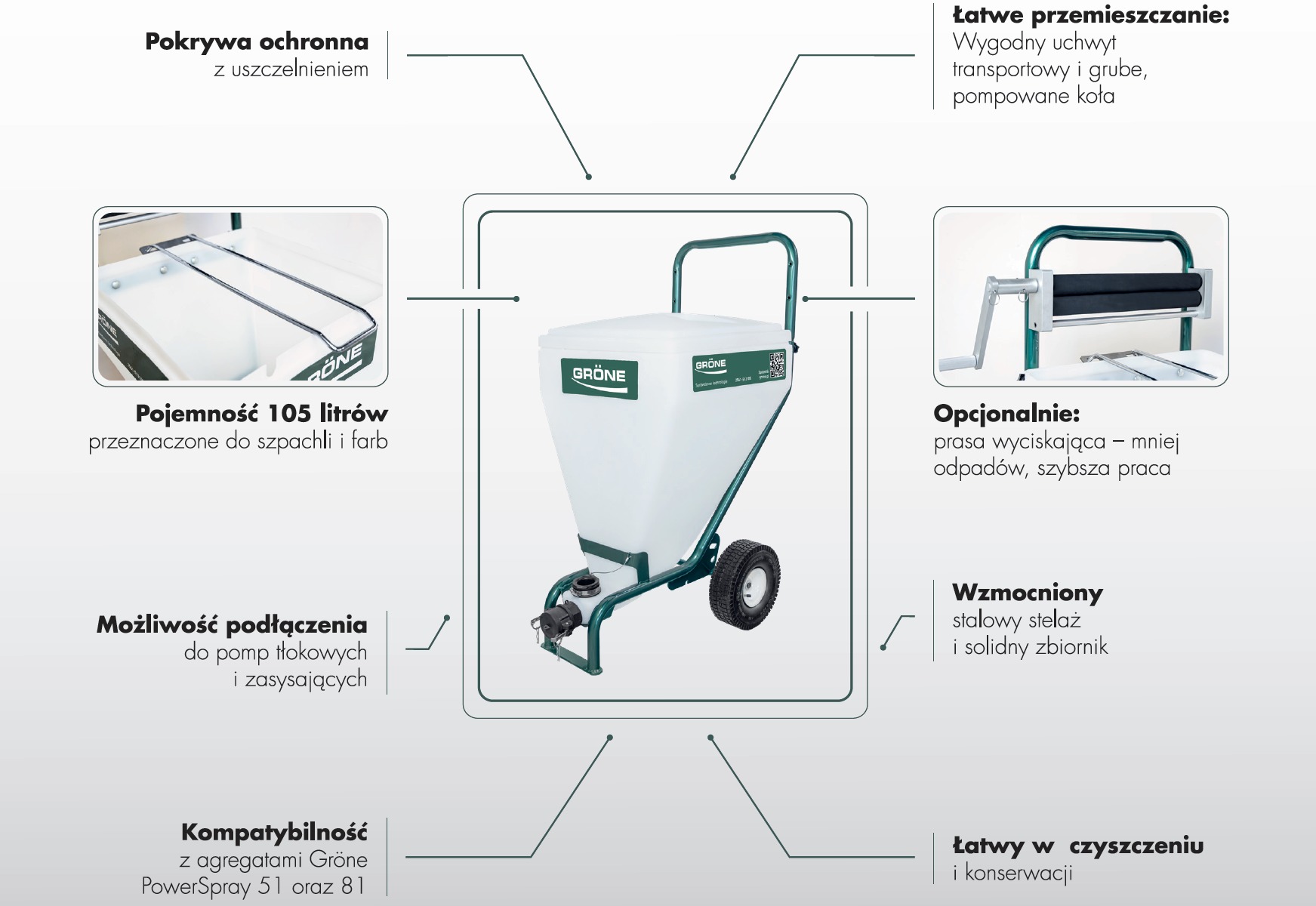 Zbiornik 105L do agregatów malarsko-szpachlarskich Gröne PowerSpray 51 / 81. Profesjonalny, mobilny zbiornik o pojemności 105 litrów -idealny do pracy z agregatami. Duża pojemność umożliwia efektywną pracę, bez przestojów. łatwy w czyszczeniu.